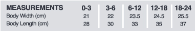 | Size | 0-3 | 3-6 | 6-12 | 12-18 | 18-24 |